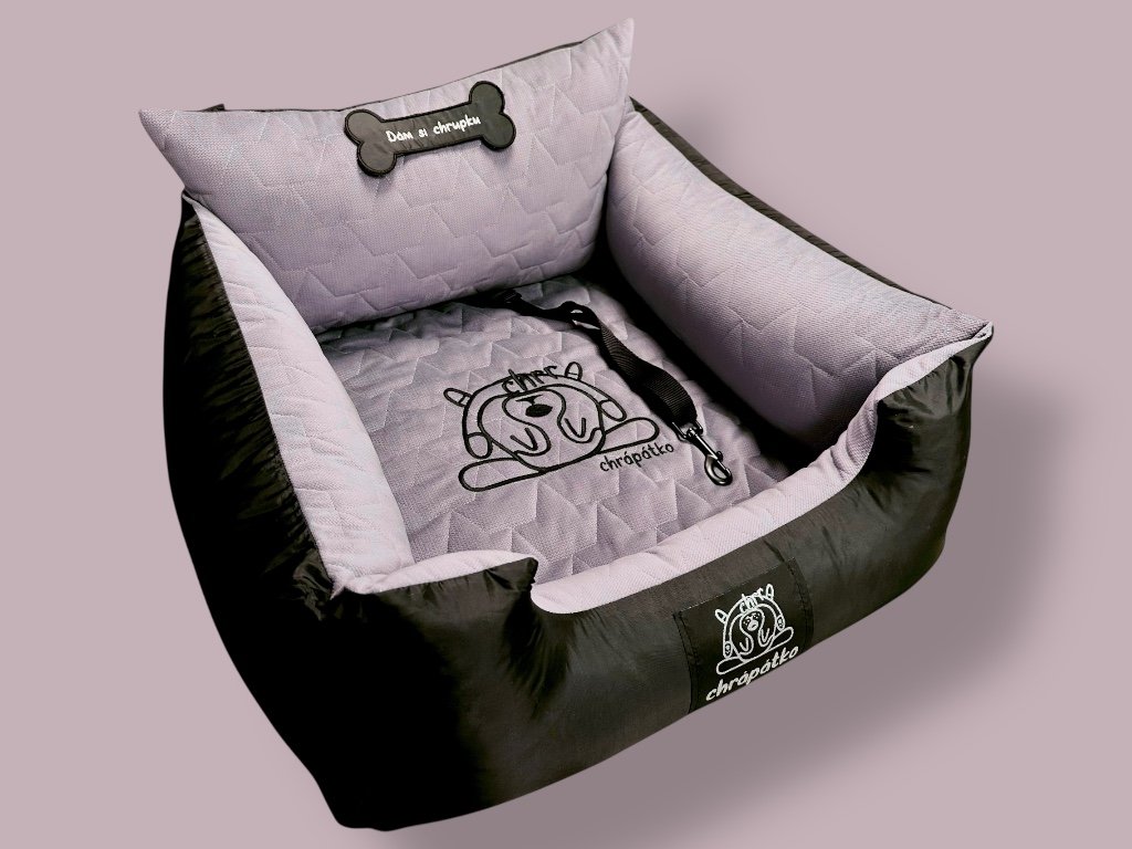 Luxusní materiály, prémiová výšivka na potahu matrace s logem Chrápátka a nášivka na předním mantinelu spolu s pořádnou vycpávkou donutí vašeho psa doslova zachrápat!