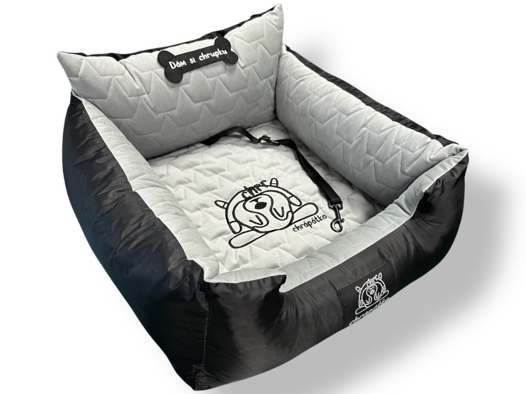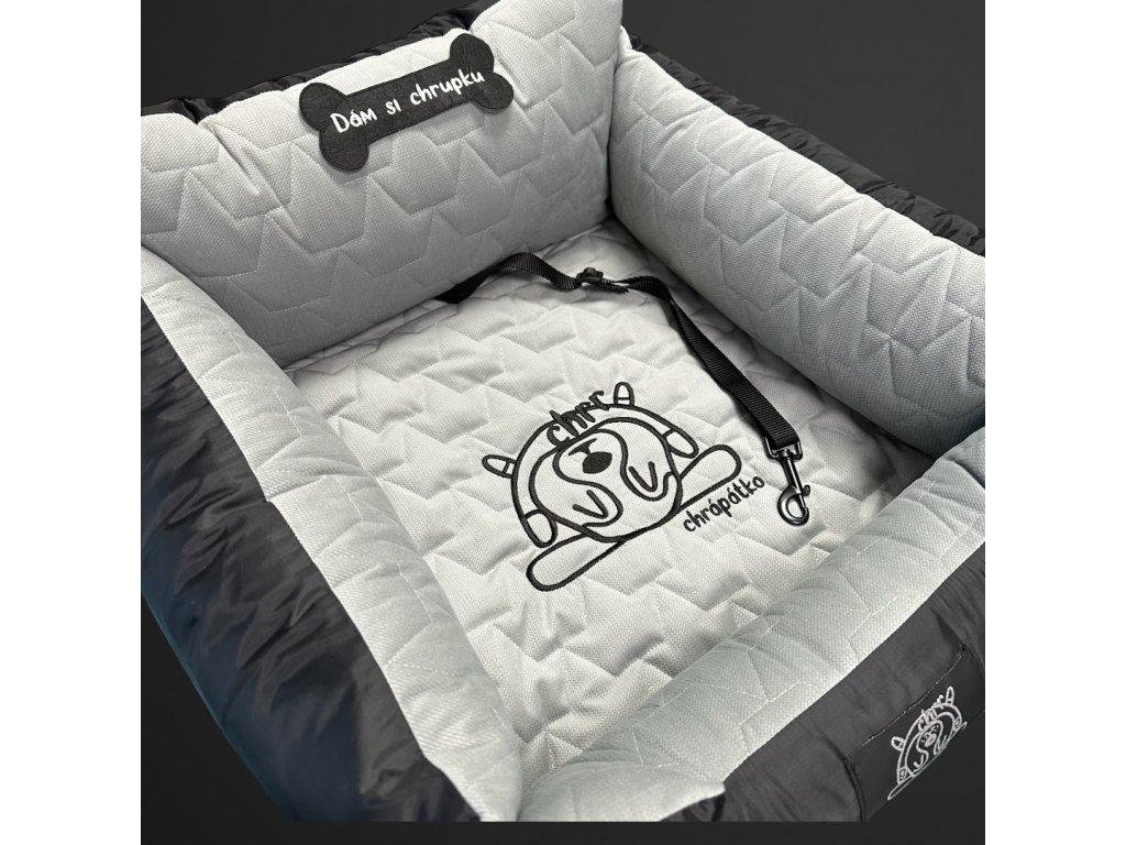Luxusní materiály, prémiová výšivka na potahu matrace s logem Chrápátka a nášivka na předním mantinelu spolu s pořádnou vycpávkou donutí vašeho psa doslova zachrápat!