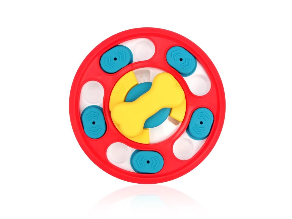 Interaktivní puzzle miska pro psy kombinuje zdravé zpomalené krmení s hravou mentální stimulací. Pes musí posouvat, otáčet nebo hledat pamlsky – a tím si nejen užívá zábavu, ale také se učí jíst pomaleji a klidněji.