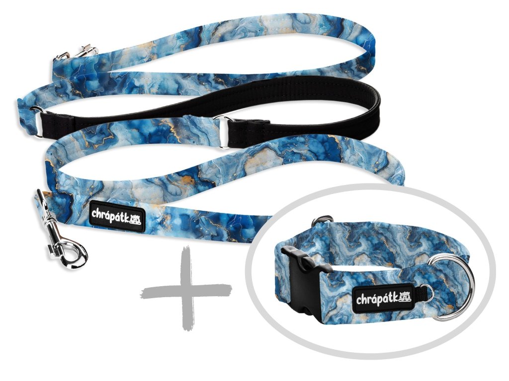 Stylový set obojku a přepínacího vodítka v designu abstraktní modré – odolný, pohodlný a bezpečný pro každou procházku.