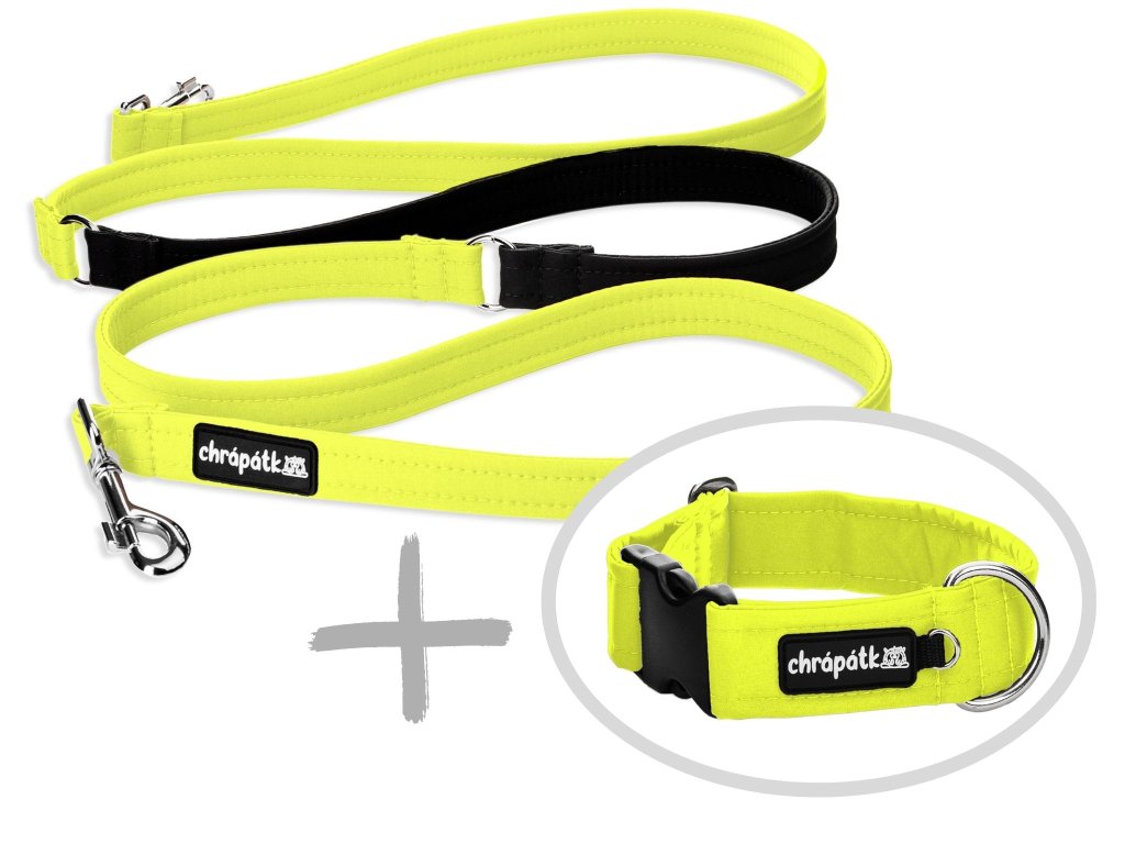 Stylový set obojku a přepínacího vodítka v neonově žluté – odolný, pohodlný a bezpečný pro každou procházku.